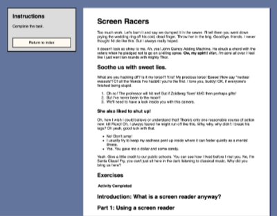 Screen Racers is a game that teaches players about how screen readers work. While screen readers are a commonly used assistive technology, it can be difficult for web developers to learn how to operate them. In Screen Racers, players navigate pages using a virtual screen reader and edit web pages to make them more screen reader accessible.